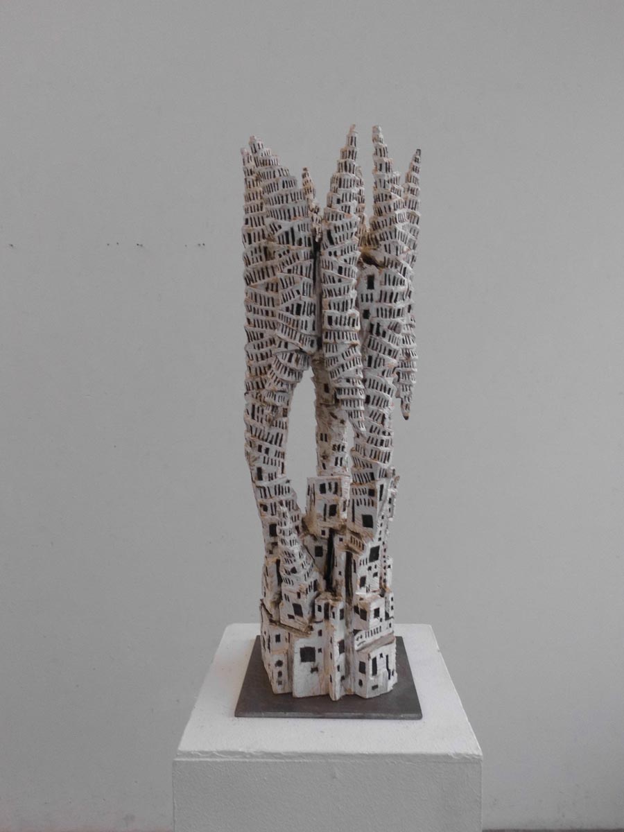 KLAUS HACK - Stadt der Türme 2, 2019, Ahorn weiß gefasst, 78,5 x28 x27,5 cm, auf Eisenplatte montiert