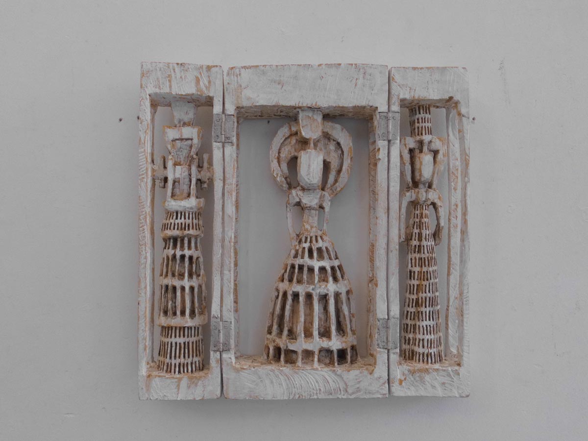 Klaus Hack, Jeanne d Arc, 2022, 2023, Pappel, Eiche, Buche weiß gefasst, 141 x112 x4o cm_©Florian Selig, Berlin